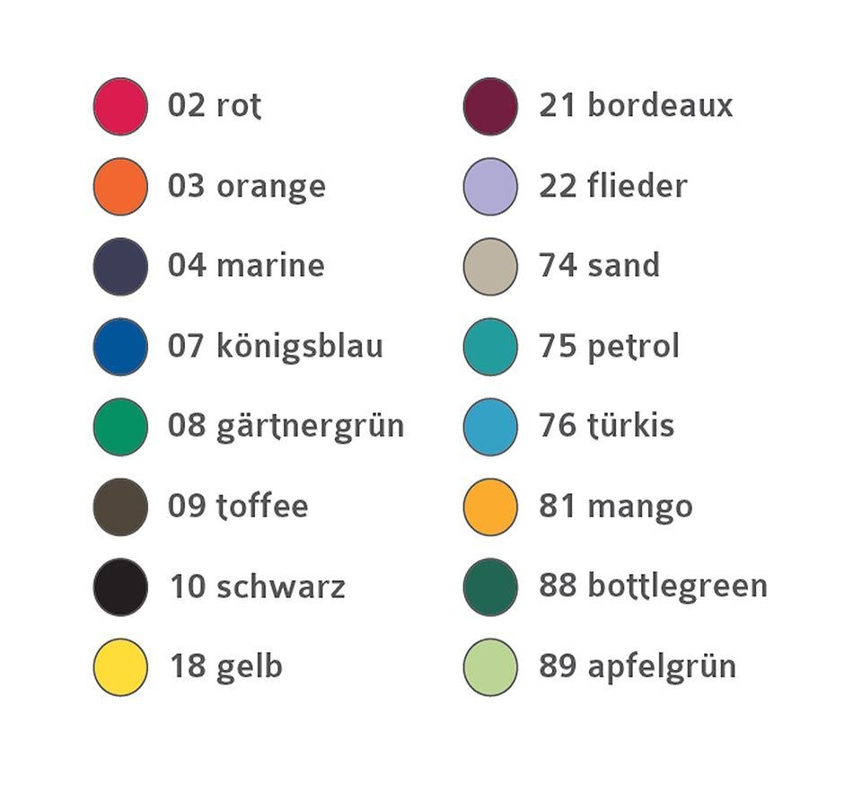 Auch in den Farben "blackberry", "darktürkis", "blassblau" und "perlgrau" erhältlich